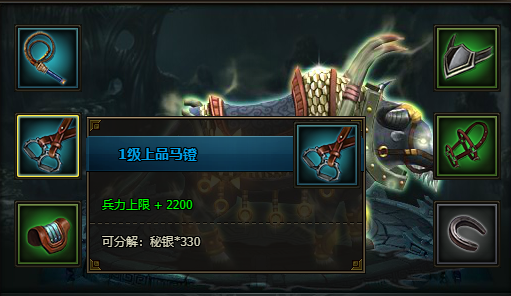 坐骑装备是只能用于坐骑身上的装备,提供全武将属性加成,获取难度较高,常规投放于活动中,且搜集到紫装品质以上的整套坐骑装备还会提供额外的效果。坐骑装备升阶需要搜集到对应的装备图纸,与图纸上写明所需的材料合成之后,材料和图纸消失,获得新的坐骑装备。坐骑装备升级需要材料“秘银”。