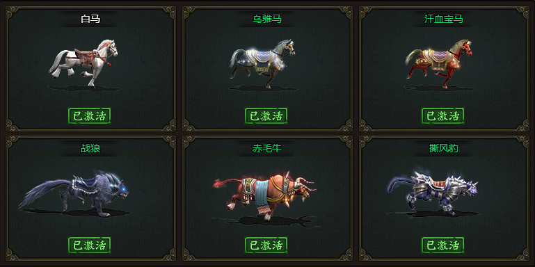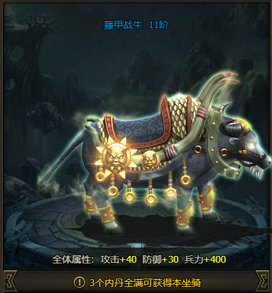 消耗坐骑内丹可以增加坐骑经验,坐骑每一级都分为攻击,防御,兵力三种经验槽,消耗内丹会增加经验槽进度,同时增加对应的属性,当前等级三种经验槽都满了之后可以进行突破,突破之后保留原有属性,清空经验槽重新累计下一级所需,突破之后外观会得到新的样貌,原版外观也会保存,可以随时切换。