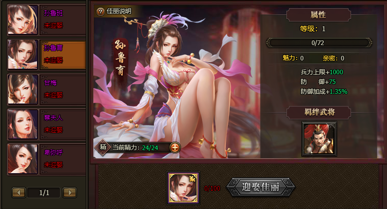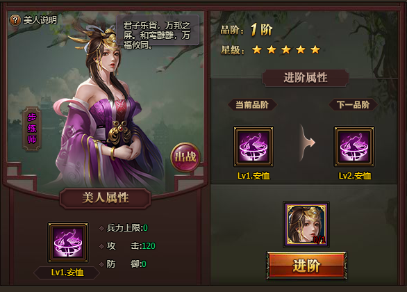佳丽可以提升全体武将属性,通过宠幸来提升佳丽等级,每个佳丽对应有一个武将组成羁绊,消耗佳丽的羁绊值可以提升专属武将的属性。
